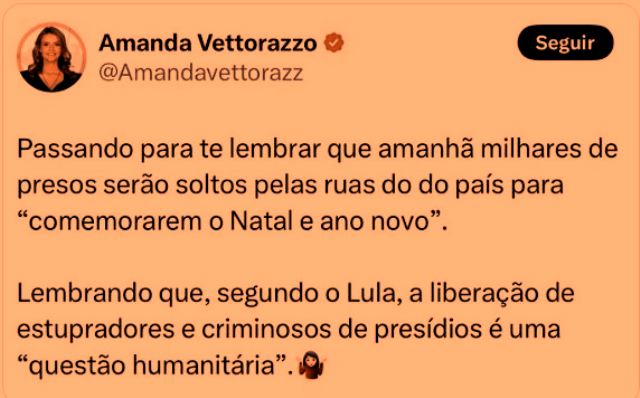 – Evidentemente, ela sabe que estupradores e condenados por crimes hediondos não entraram no indulto de Natal, nem feminicidas e nem golpistas. Sorte dela que não foi a Brasília dia 08 de janeiro.