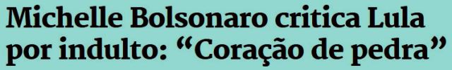 2 – Depois dizem que é implicância minha. Dona Michelle, com sua imensa fé evangélica, ficou assaz abespinhada com os indultos de Natal assinados pelo Lula. Queria que ele fosse mais benevolente com os golpistas que invadiram os três poderes.