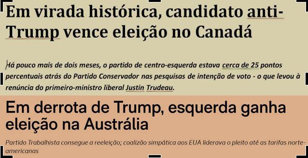 3 – Eu tenho a impressão que a esquerda mundial ainda vai erguer uma estátua para Trump. Ele se tornou seu maior cabo eleitoral. As vitórias praticamente garantidas dos conservadores no Canadá e na Austrália foram revertidas nas eleições gerais após Trump… -…impor sua guerra comercial ao mundo. Governantes autoritários como Putin e Xi Jin Ping é que não estão gostando. Se ele mantiver suas políticas fascistas, logo eles serão considerados democratas e isto pode alimentar os sonhos de liberdade de seus povos.