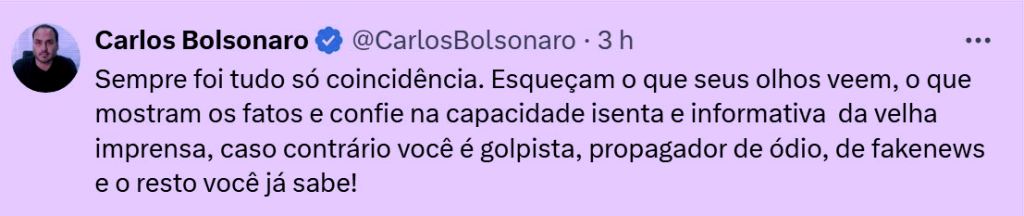 – Mas isto já tem dias e foi divulgado no dia da fumaça branca no Vaticano (que ocupou todas as Mídias). Cadê a disseminação maciça da fala dele pelas redes progressistas, pelos robôs petistas?Só posts de parlamentares de esquerda é pouco. Estão esperando uma intervenção divina?