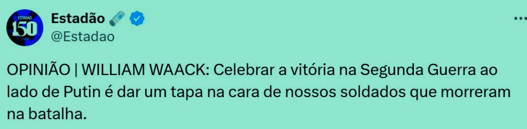 3 – Eu conheço alguma coisa de História e sei que o que a Rússia está comemorando é a vitória sobre os nazistas na 2ª Guerra Mundial. Uma vitória devida a russos, americanos, europeus e brasileiros, pracinhas recrutados entre filhos de sitiantes e de colonos do Interior.