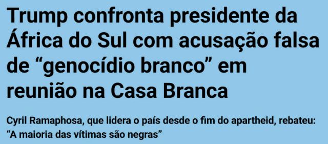 – A denúncia verdadeira é o genocídio de palestinos por Israel, a denúncia falsa é o ‘genocídio’ de afrikaners brancos pelos negros da África do Sul. E o estrategista é Trump, que quer que o mundo aceite tornar Gaza um resort de luxo para milionários… sem palestinos vivendo lá!