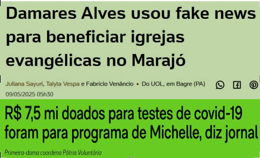 9 – De um lado, o Ministério Público acusa a ex-ministra Damares Alves de desvio de R$2,5 milhões do Programa Abrace Marajó para uso de igrejas evangélicas em grilagem de terras. De outro, o TCU identificou que R$7,5 milhões pra compra de testes de covid foram…