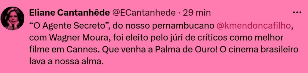 3 – Pois é… Ainda Estou Aqui foi parar em Hollywood e ganhou o Oscar de Melhor Filme Estrangeiro. Agora, o Agente Secreto ganha o de Melhor Ator (Wagner Moura) e Melhor Diretor (Kleber Mendonça) em Cannes. E, claro, garante passagem pro próximo Oscar).