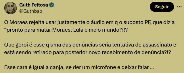 -…incluísse o áudio do policial federal que confirmou a existência do plano para matar Lula, Alkmim e o próprio Xandão como parte do golpe. Ele não faz parte da denúncia da PGR e só poderá ser considerado se for adicionado a ela no decorrer do julgamento, certo, Dr.Fux?