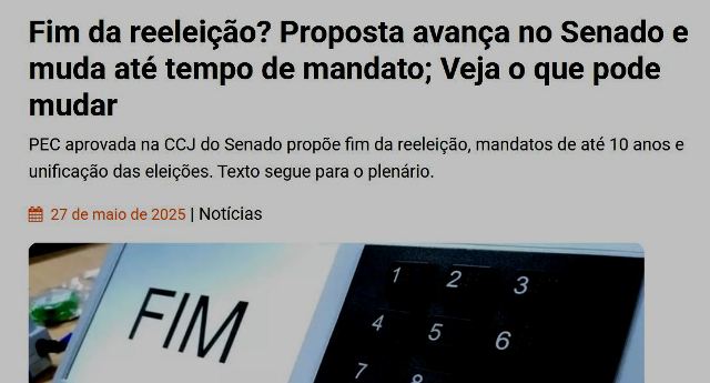 – 2. Reeleição uma única vez para qualquer cargo executivo ou legislativo. No sistema atual, não se legisla e não se governa mais… só se pensa e se trabalha com vistas às próximas eleições.