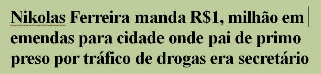 – Não é por aí… seus seguidores só se informam na rede dele e o que ele faz com o próprio nariz é problema dele. Grave é ver que a cidade em que seu tio, pai do traficante, foi candidato a prefeito, recebeu esta grana das emendas e não saber em que ela foi usada.