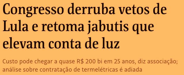 – O resultado é um aumento de 3,5% na conta de luz dos consumidores (que pode chegar a 10% se derrubarem outros vetos). A imprensa critica Suas Excelências, claro, mas esquece que Lula vetou os jabutis e, daí, o culpa por não ter base no Congresso. Essencial é culpá-lo, né?