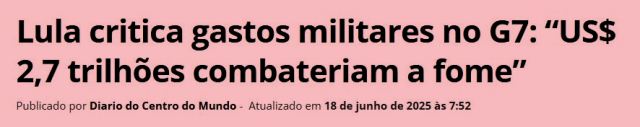 3 – Lula na reunião do G-7: “Ano após ano, guerras e conflitos se acumulam. Gastos militares consomem anualmente o equivalente ao Produto Interno Bruto da Itália: são US$ 2,7 trilhões que poderiam ser investidos no combate à fome e na transição justa”.