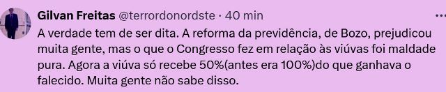 – Os homens sustentam a casa onde as mulheres permanecem para cuidar do lar e dos filhos. O que, aliás, justificou a redução da pensão da viúva na reforma da Previdência aprovada no governo do ex-mitô. Ah! As filhas dos milicos não foram afetadas…