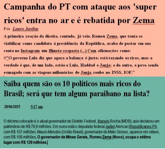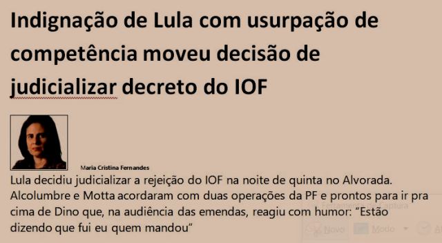-…e Lula não evoluiu” ou “Sem ajuste fiscal, o Brasil vai falir em 2027” ou “Qual é o programa do governo?” Agora, o enfoque será o choque dos poderes. Se o governo for ao STF contra a derrubada do IOF, vai se começar a berrar pelo impeachment. Repito: Lula não é Dilma, sabiam?