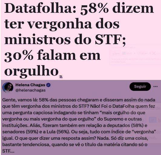 9 – A Folha e seu instituto de pesquisas continuam com saudades dos tempos sombrios. Com perguntas feitas visando respostas adrede desejadas, eles fazem uma pesquisa cujo resultado é que a maioria dos brasileiros sente vergonha das instituições públicas do país.