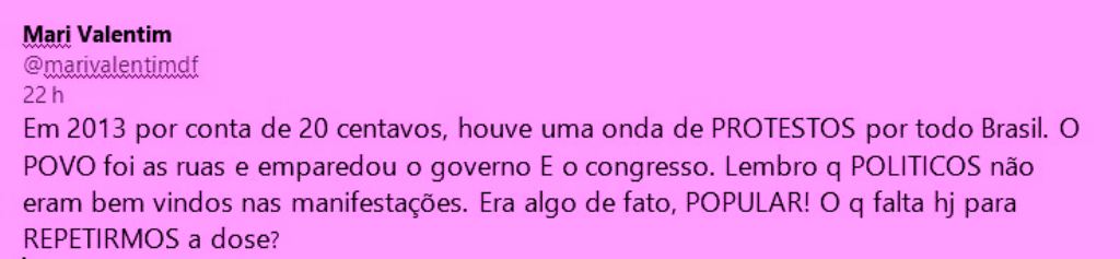 5 – São várias as razões, começando pela passividade histórica do povo. Os protestos por aqui sempre começaram pela mobilização da classe média (abolição em 1888, República em 1889, Vargas em 1930, marchas com Deus e Família em 1964, Diretas Já em 1983).