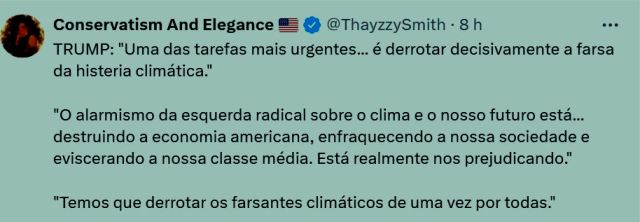 – Pois o Trump segue na mesma toada. As mudanças climáticas vêm provocando desastres e matando milhares de pessoas no mundo todo e ele só pensa ‘naquilo’, a economia americana.