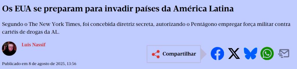 – Preocupação haverá quanto às atitudes de possíveis novos ameaçados. Resistirão ou baixarão as calças? Graças aos bolsonaristas e a certa imprensa brasileira, nosso conceito de soberania anda muito elástico.