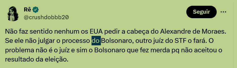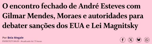 5 – Certamente é coincidência – eu não trabalho na Globo nem sou influencer – mas o fato é que recente pitaco meu parece ter sido ouvido em altos escalões da Justiça. Eu disse que Lula deveria convidar André Esteves para participar de negociações com Trump sobre o tarifaço.