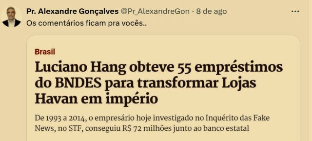 -…ex-mitô, não só expandiu suas lojas que vendem produtos comunistas chineses sonegando impostos como levantando financiamentos subsidiados no BNDES. No Brasil, isto não é safadeza… é esperteza de empresários.