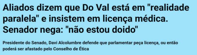 – Ainda não o entendo, mas já consigo vislumbrar certas psicopatias que se abatem sobre alguns de nós e tenho certeza que o senador Do Val, como ele diz, ‘não está doido’. Se megalomania fosse sinal de loucura, Trump já estaria internado com camisa de força…