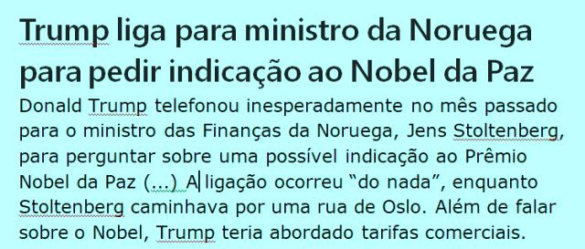 – Pode até ser que ganhe o Prêmio Nobel da Paz. No mundo em que hoje vivemos, jogar bombas em depósito nuclear do Irã, armar Israel para eliminar o povo palestino e doar à Rússia parte do território ucraniano são bons argumentos a seu favor.