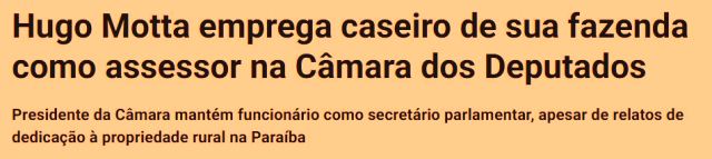 1 – Na verdade, está muito além de desonestidade ou desrespeito com o povo. O fato do Hugo Mota, presidente de um poder e 3° homem na linha de sucessão do país, botar o caseiro de sua fazenda como secretário parlamentar, com salário de R$7,2 mil/mês, pago por…
