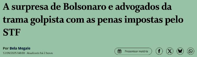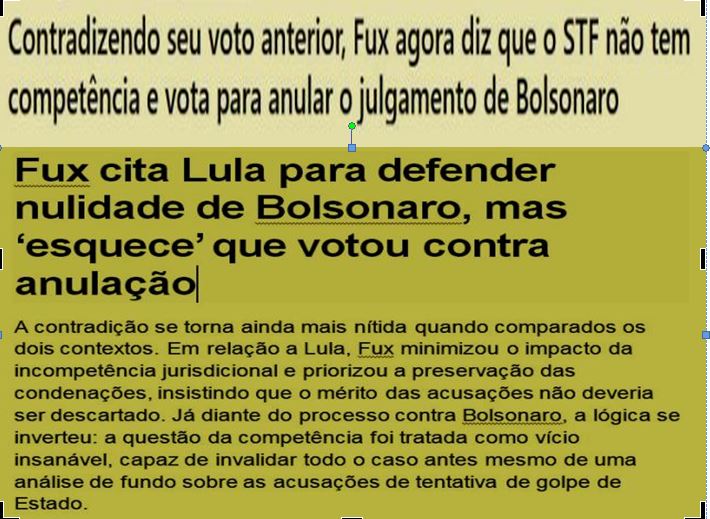 – E isto ficou cristalino no seu voto pela absolvição da cúpula do golpe de todos os crimes praticados. As exceções, Braga Neto e Mauro Cid, são mero disfarce pra dizer que houve a tentativa de golpe, mas a culpa foi apenas dos bagres, mais de 400 que ele já acusou e foram presos.