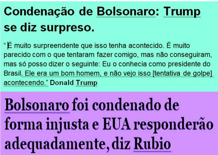 5 – A manifestação de Trump era esperada: independente dos serviços a ele prestados pelo Dudu 03 e o neto do ditador, traidores da Pátria Amada, Salve, Salve, ele receia que a decisão da Justiça brasileira seja, de repente, copiada por lá, e aplicada a ele pela Suprema Corte.