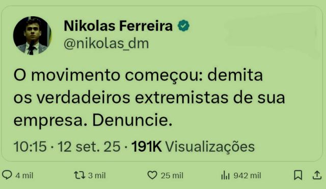 -…investir contra o adversário escolhido para inimigo, a esquerda. E os fascistas brasileiros correm a imitá-lo. Como pegaria mal um crente em Deus pedir a morte dos inimigos, Nikolas só pede pra eles serem demitidos. Mas, quando chegar ao poder…