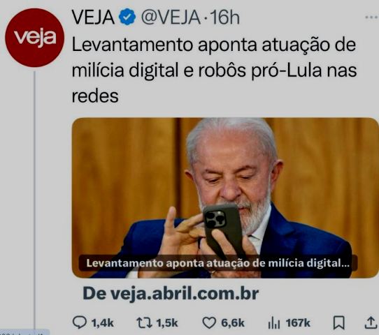 1 – Meus deuses… quer dizer que a Veja descobriu que a esquerda também sabe e usa robôs pra disseminar informações pelas redes sociais? Ela achava que só a direita tinha capacidade pra fazer isto? Lógico que os bolsonários têm mais know how… Eles aprenderam…