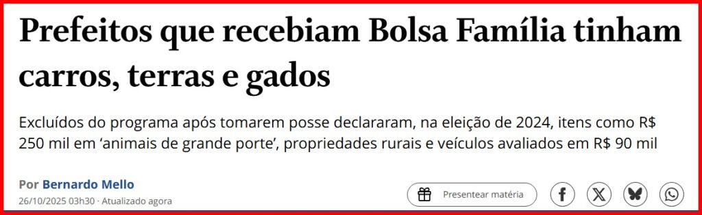 10 – É óbvio que os órgãos de fiscalização do Estado são lerdos, deficientes e, muitas vezes, lenientes. Executivos e edis municipais assumiram seus cargos há 10 meses e só agora o governo excluiu 1,1 mil vereadores, 07 prefeitos e 19 vice que recebiam o Bolsa-Família.