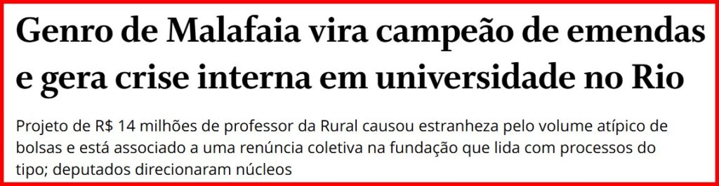 11 – Família que peca unida permanece unida. Pastor Malafaia, guru do ex-mitô, todos conhecem… mas um de seus genros virou alvo da Imprensa só agora. Professor, ele lidera a captação de emendas parlamentares em universidade do Rio: R$14 milhões do Ministério dos Esportes.