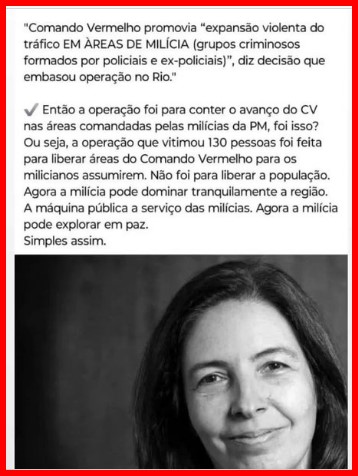– Acho que o próprio nome dado a ela pelas forças policiais já dá motivo pra tais desconfiança: contenção do que? Da violenta repressão do CV em áreas milicianas? E quem é mesmo que tem fortes ligações com as milícias?