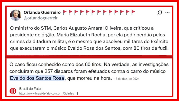 – 40 anos depois de sua derrubada, a presidente do STM pediu desculpas pelos crimes cometidos, mas teve general supremo que não gostou. Como no caso do músico Evaldo no Rio, ele acha que milicos que matam são, antes de tudo, inocentes.