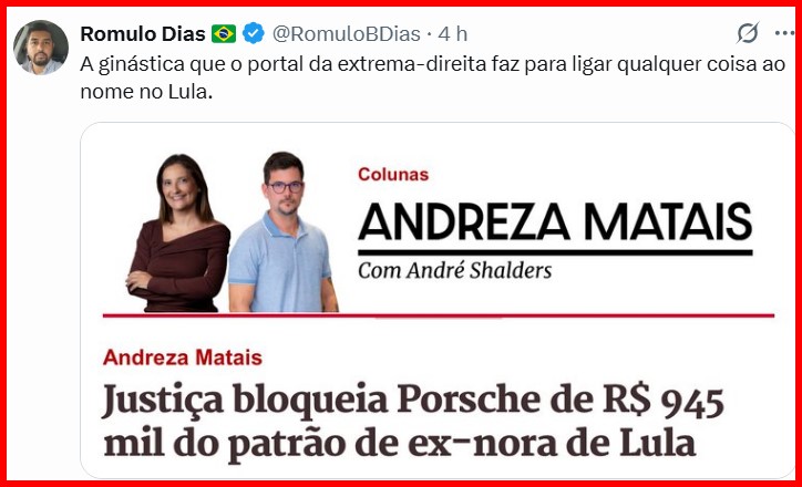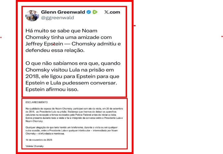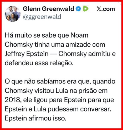 5 – É… ficou feio para um jornalista que já ganhou o Pullitzer! Ele lançou uma fofoca sobre um telefonema que Lula dera, da prisão, para o pedófilo Epstein, razão do escândalo que envolve o Trump hoje. E botou o filósofo Chonsky, que visitava o prisioneiro, como intermediário da ligação.