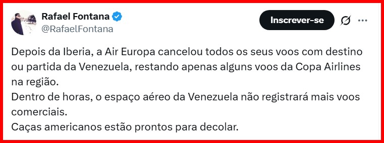 – Desde 3ª feira (25) eu espero ver o som apavorante do Extra da Rede Globo anunciando a invasão da Venezuela por helicópteros Apache americanos e o bombardeio do Palácio Miraflores com Nicolás Maduro lá dentro. Parece que os bolsonaristas pátrios estão mal informados.
