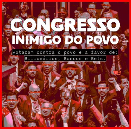 – Mas o que impede o desenvolvimento do Brasil é o desajuste fiscal, a gastança do governo Lula com programas sociais. O Mercado não pode permitir esta comunização do país! Vamos subir a hashtag: POVO INIMIGO DO CONGRESSO!