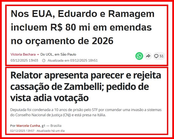 -…e, mesmo fugindo pros Estados Unidos, continua deputado com gabinete, gastando verba com gasolina e fazendo jus a emendas parlamentares, assim como Dudu 03 e La Zambelita, presa na Itália, aguardando sua extradição pro Brasil, onde está condenada a 15 anos.
