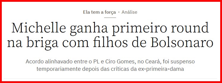 – Seu imbrochável marido está preso e inelegível até a morte. E a prole dele, mesmo os eleitos com milhões de votos, têm limitações intelectuais semelhantes à do 04. Jair não quis arriscar: ungiu o Flávio. Fosse Michelle, Bolsonaro sobreviveria, mas só o sobrenome!