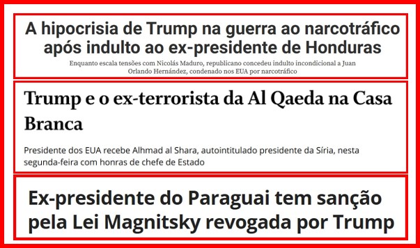 10 – Eu tenho a impressão que a humanidade ainda vai agradecer a Donald Trump por ter sido presidente dos Estados Unidos. Ele está provando, como nenhum outro líder mundial conseguiu fazê-lo até hoje, o que significa, realmente, o imperialismo americano. – Ele é a essência do pensamento da América branca, anglo saxônica e protestante desde sempre. Trum prova isto com 03 decisões: recebe um terrorista com honras de Estado, indulta um traficante e revoga a lei Magnstiky que sancionava um corrupto. We are the World! With us no one can
