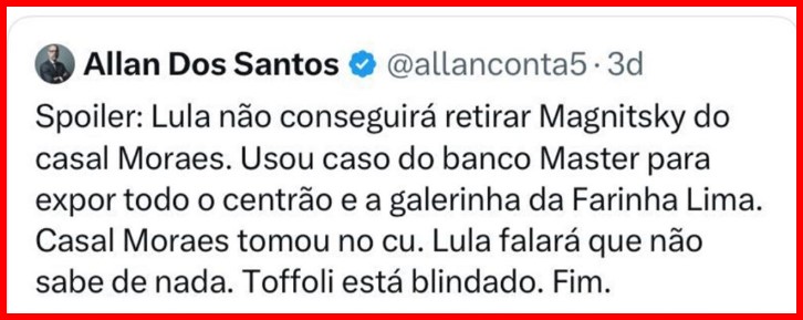 3 – Para alguém que se gaba de ser um cara muito bem informado e com uma capacidade superior para analisar os fatos políticos, Allan dos Santos cometeu uns erros infantis: acreditou nos dois babacas bolsonários, acreditou que Trump preocupava-se com algo além do seu umbigo…