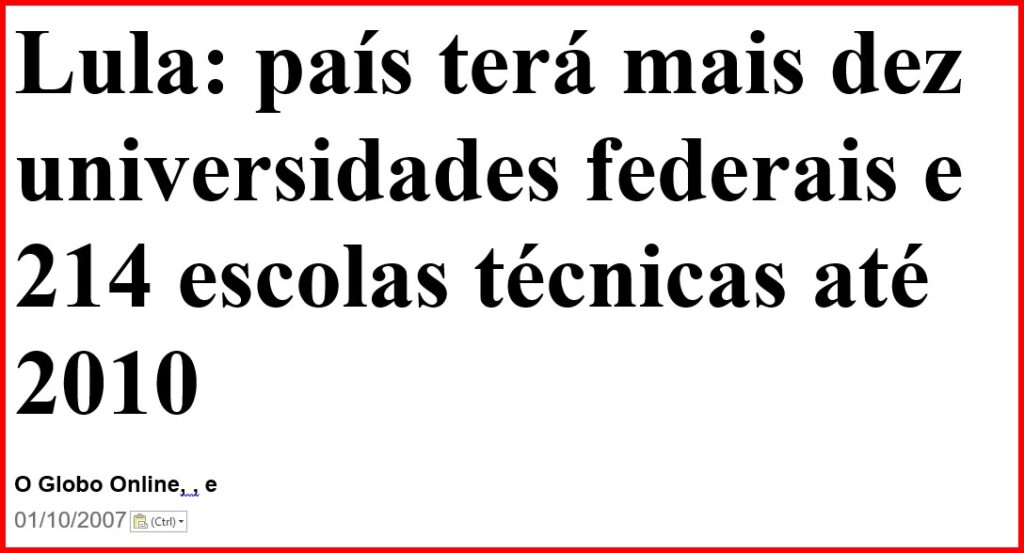1 – Não há político no Brasil que não proclame, alto e bom som, que a educação é a mola mestra do desenvolvimento de um país. Mas, nos governos Lula, a direita cheirosa bradava que ele só queria transformar as universidades em centros de doutrinação política.