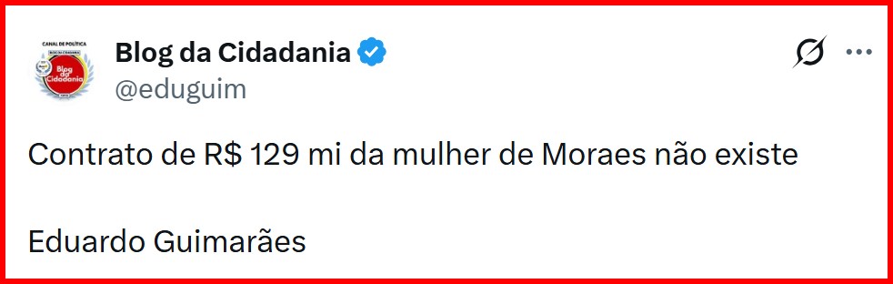– Há um contrato do escritório de advocacia da mulher dele com o Banco Master e, segundo sua fonte ou fontes, e ele pressionou Banco Central e PF para salvar o banco. O quebra-pau foi e continua sendo intenso. Entre acusadores e defensores dele e dela.