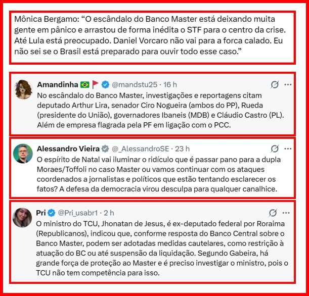 5 – É a tradição! Natal, Ano Novo, festas, confraternização… Brasília se esvazia, Congresso silencia, bastidores emudecem, cadê as notícias? Tinha que mudar algum dia! O escândalo do banco Master é tão profundo que a tradição foi pras cucuias…