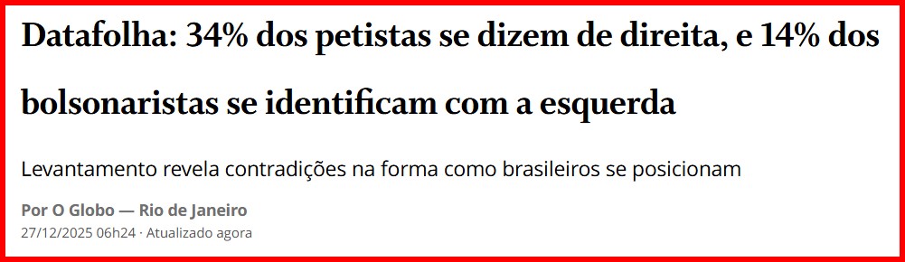 11 – O alarmante no resultado do DataFolha é que 48% dos brasileiros não têm a menor ideia do que seja esquerda e direita. Eles misturam Deus, Pátria e Família com aceitar ou não o aborto e com direitos iguais para mulheres e com bandido bom é bandido morto!