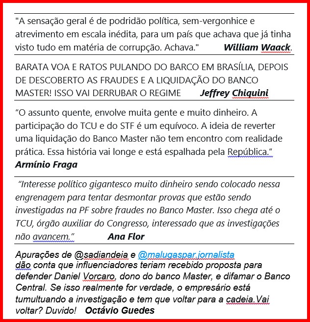 1 – As repercussões atuais do escândalo do banco Master talvez indiquem um caminho positivo na mesmice que sempre caracterizou os escândalos políticos no país. Não sei se houve um choque entre grupos de poder, gerando uma disputa que impediu…