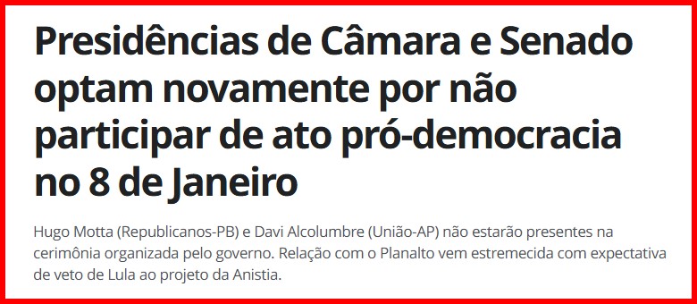– A ausência dos presidentes da Câmara e do Senado na cerimônia em defesa da democracia ontem, Casas que, não custa lembrar, foram invadidas e depredadas, é uma prova contundente disto.