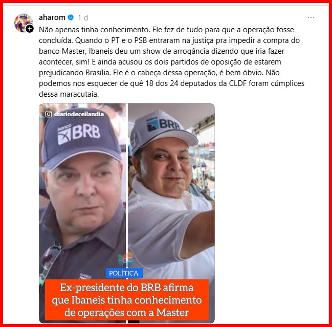 -…prevista pelo Armínio Fraga, que conviveu intimamente com a podridão da República. Mesmo que punições acabem atingindo algumas figuras públicas, é certo que Ibaneis, Celina Leão e os 18 distritais que aprovaram a safadeza saiam ilesos e se elejam.