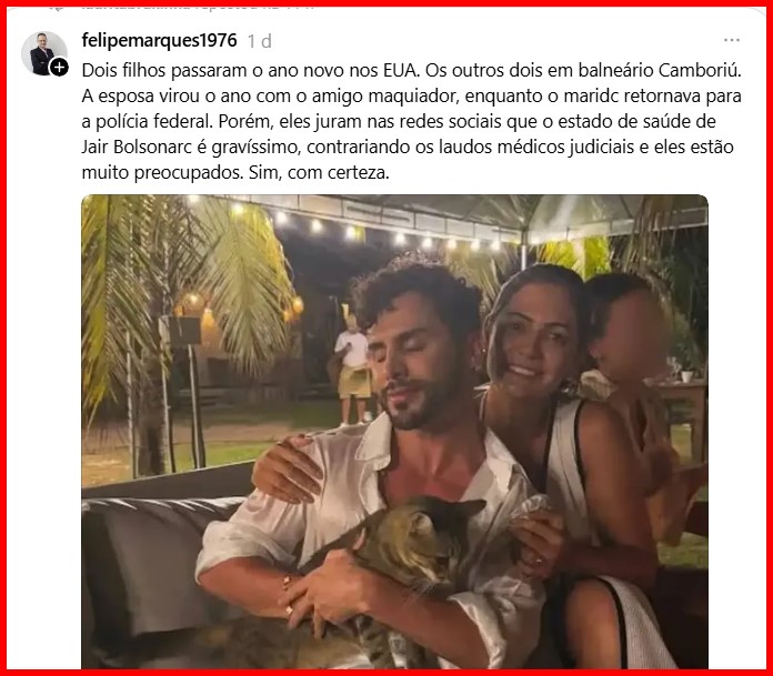 -…conforme o pungente relato de sua dedicada consorte, não foi corroborada pelos 05 exames realizados no luxuoso hospital DF Star, e ele retornou pra sua cela na PF. Acho até que a queda dele da cama foi um protesto: nem mulher, nem filhos passaram o ano com ele…