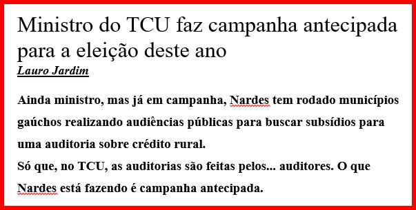 – Sabemos todos que parlamentares têm um natural viés amoral que, em certos casos, atinge a imoralidade mesmo. Mas de um ministro de um Tribunal, mesmo não sendo uma instituição judicial, era de se esperar decoro e respeito às leis. Nardes prefere ser deputado!