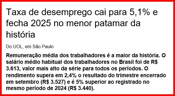 -…suas políticas econômica, social e fiscal (gastadora). Em 2025, o desemprego no Brasil foi o menor da série histórica (5,6%). E eles já dizer que o desemprego não é um bom parâmetro mais. Informalidade, envelhecimento e até IA são as razões disto! São umas gracinhas, não são?