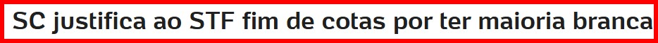 3 – Racismo na veia é isto aí! Como se sabe, Santa Catarina aprovou uma lei proibindo cotas raciais, o que é inconstitucional no Brasil. O STF mandou o governador e a Assembleia justificarem a proibição. E o governo respondeu que o Estado é o mais branco do país (81,5% da população).